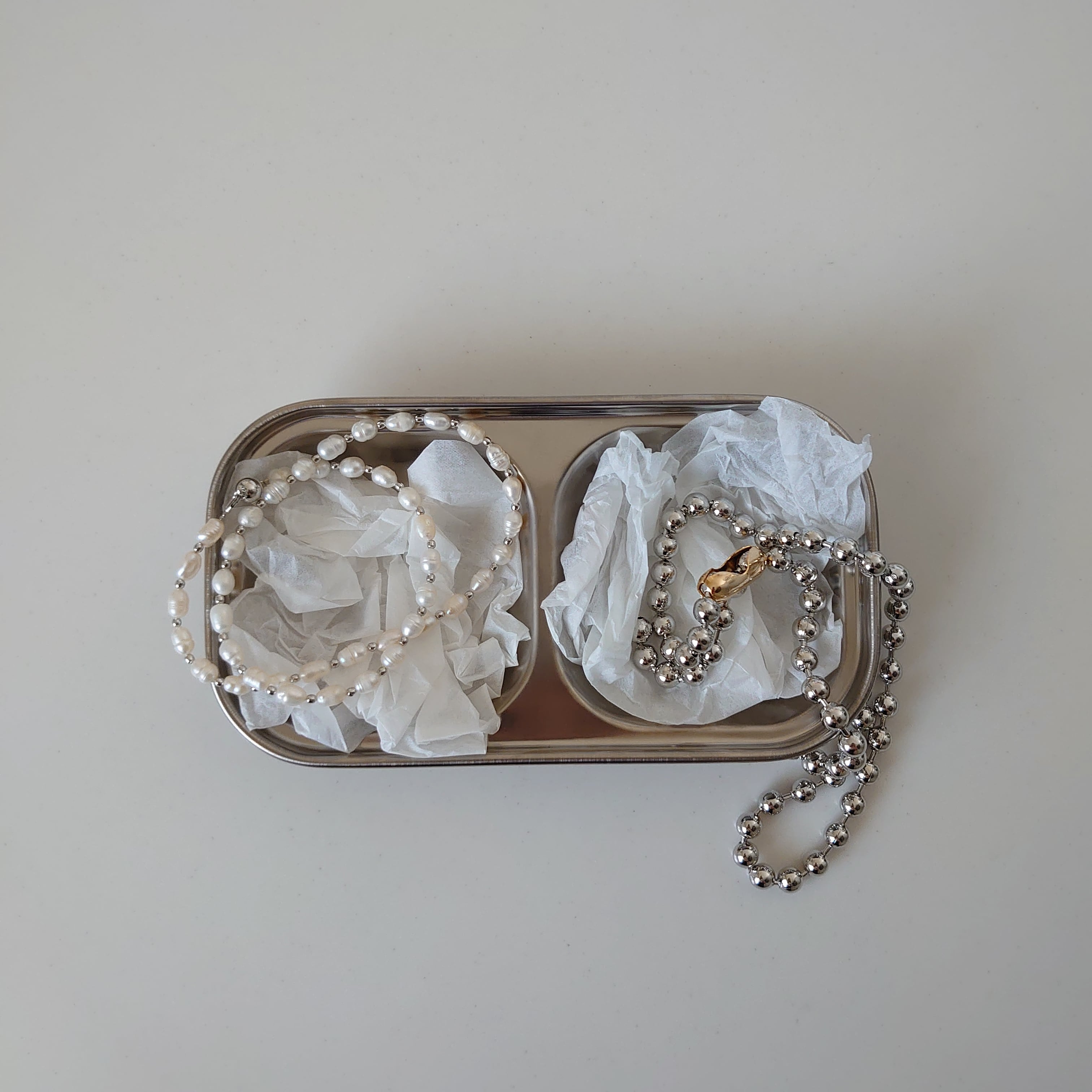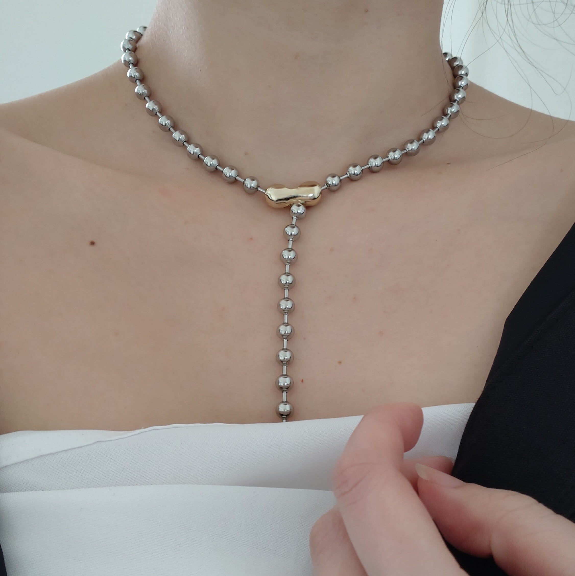 ボールチェーンはシルバーで金具部分がゴールドになっており、付け方をかえて楽しめる2way タイプです。